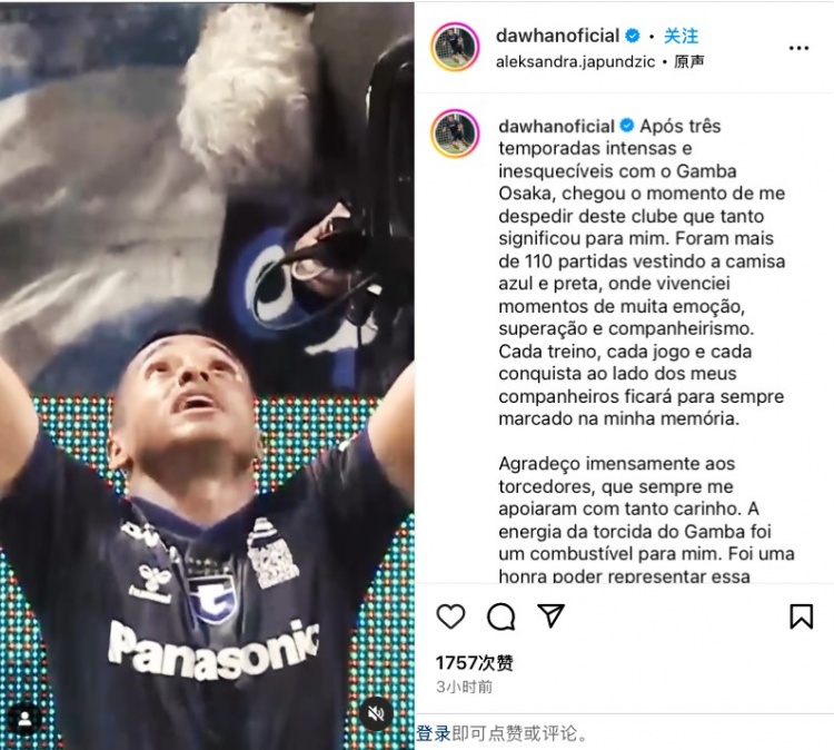 在轉(zhuǎn)會官宣后,達(dá)萬社媒發(fā)布視頻集錦,向大阪鋼巴球迷告別。他寫道: