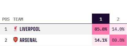 最新演算結果顯示,利物浦的奪冠概率為85.8%,大幅領先于阿森納的14.1%。