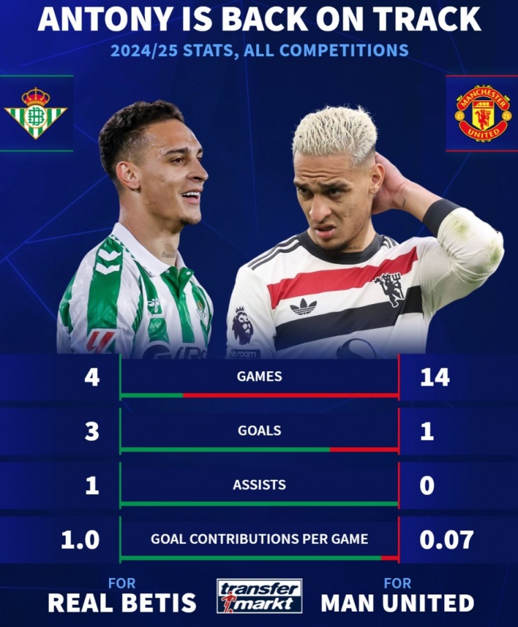 數(shù)據(jù)統(tǒng)計顯示,安東尼在冬窗加盟貝蒂斯后4場貢獻3球1助攻,場均直接參與1球。