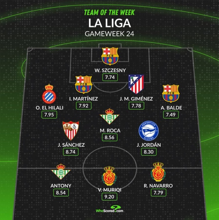 2月18日訊 WhoScored評(píng)選出了本輪西甲比賽的最佳陣容,安東尼入選。