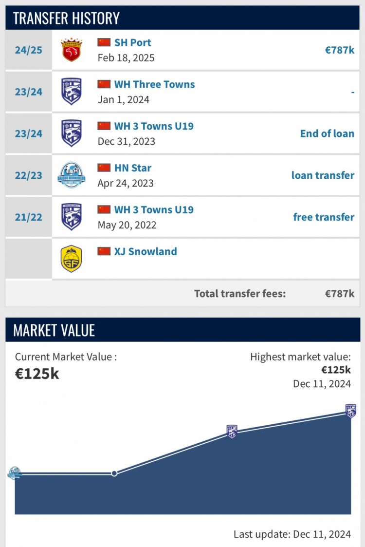 在吾米提江的個(gè)人頁(yè)面顯示,他已于2月18日加盟上海海港,轉(zhuǎn)會(huì)費(fèi)78.7萬(wàn)歐元(約合600萬(wàn)人民幣),不過(guò)合同年限暫未披露。目前,吾米提江的個(gè)人身價(jià)為12.5萬(wàn)歐元。