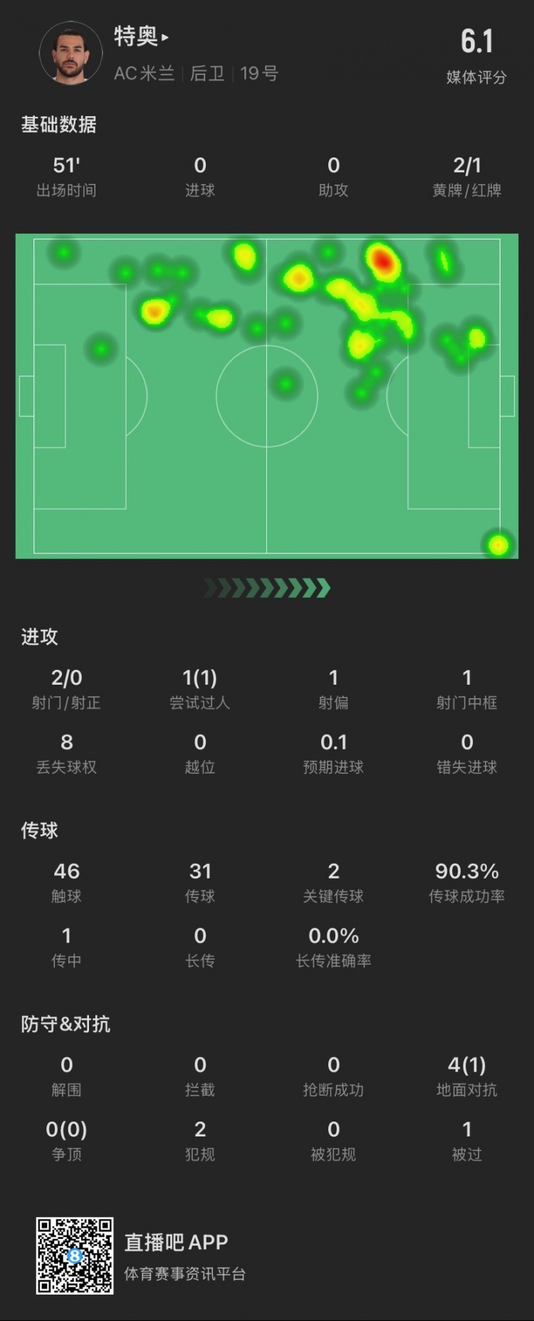 2月19日訊 歐冠淘汰賽階段附加賽次回合,米蘭對陣費耶諾德的比賽正在進行。特奧染紅離場,出場51分鐘獲評6.1分。