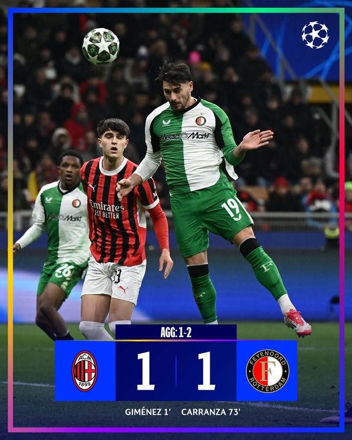2月19日訊 費(fèi)耶諾德在本輪歐冠附加賽次回合1-1戰(zhàn)平米蘭,總比分2-1晉級(jí)。