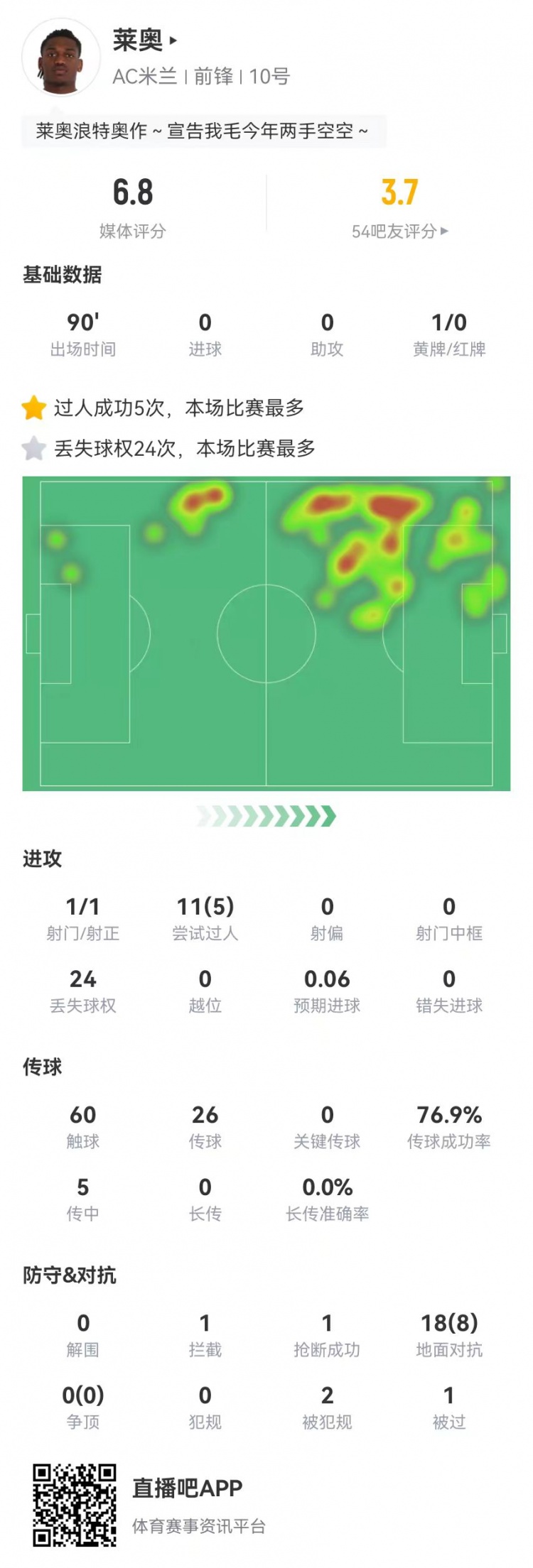 2月19日訊 米蘭在本輪歐冠主場被費(fèi)耶諾德逼平,萊奧本場數(shù)據(jù)如下: