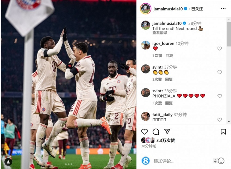 穆西亞拉社媒曬出與絕平功臣戴維斯慶祝的照片,并配文:“戰(zhàn)斗到最后!下一輪????????”