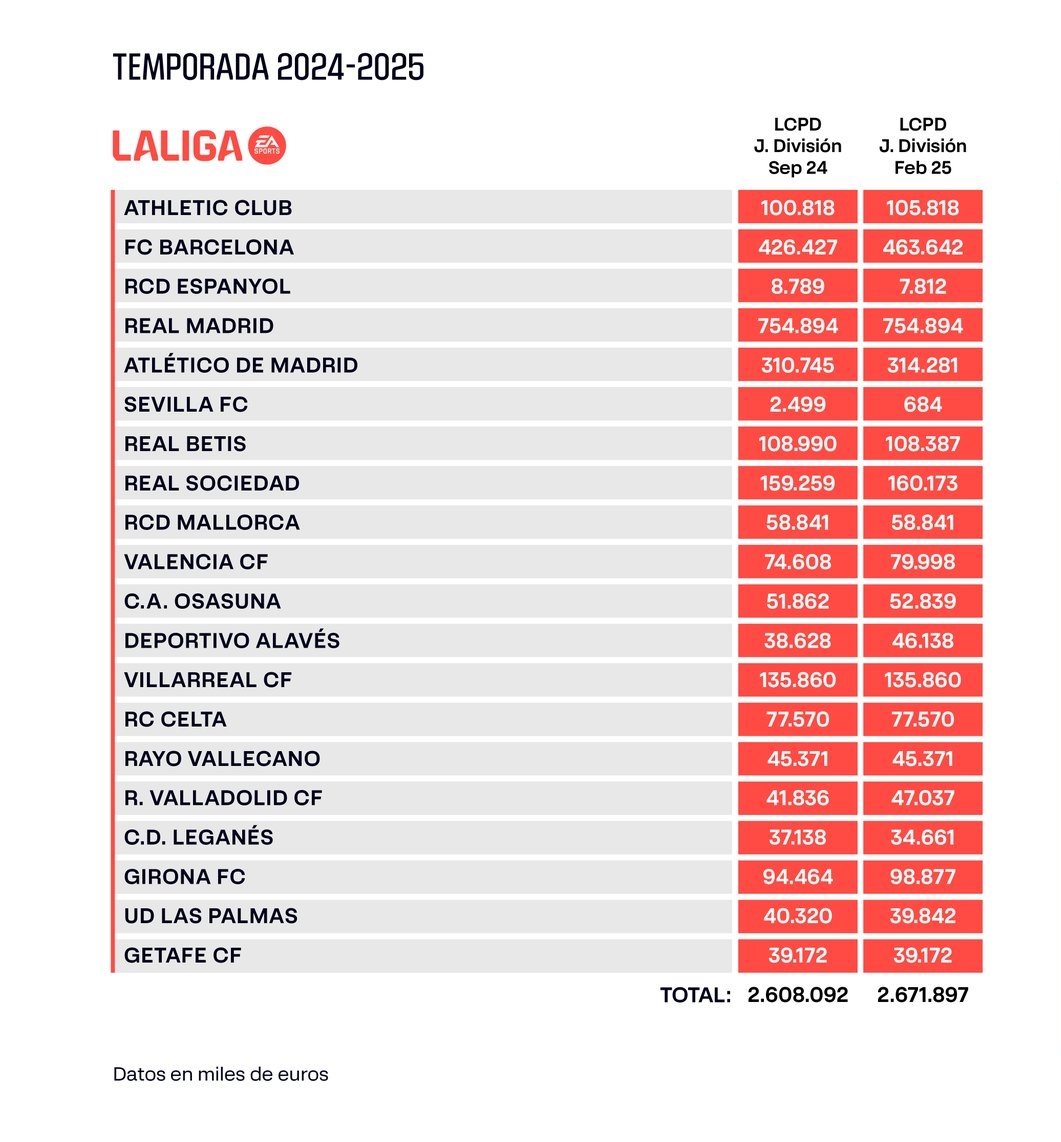 西甲官方在冬窗后更新了更新的各隊工資帽,皇馬7.55億歐居首,巴薩4.64億歐第二。