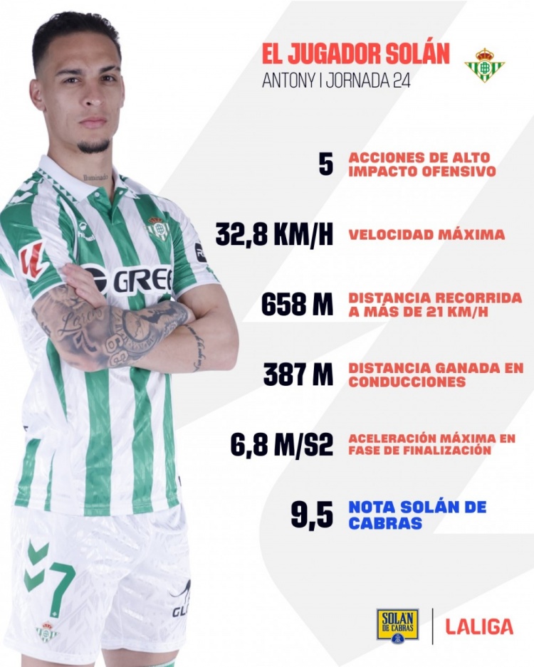 2月19日訊 西甲第24輪比賽,安東尼傳射+造點,幫助貝蒂斯主場3-0擊敗皇家社會。西甲官方統(tǒng)計安東尼本場比賽的部分?jǐn)?shù)據(jù)。
