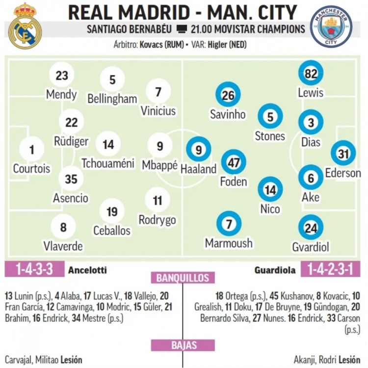 西班牙媒體《馬卡報》預測了兩隊此役的首發(fā)陣容,皇馬中衛(wèi)組合為呂迪格+阿森西奧,巴爾韋德出任右后衛(wèi)。曼城方面馬爾穆什、尼科-岡薩雷斯、劉易斯首發(fā)。