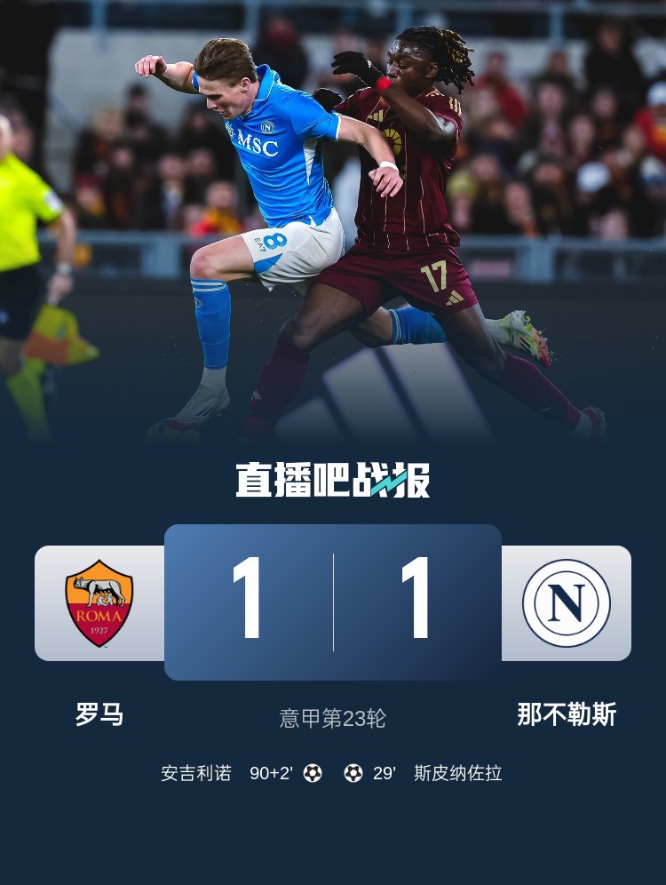 意甲第23輪,羅馬1-1那不勒斯。上半場(chǎng),斯皮納佐拉挑射建功;下半場(chǎng),傷停補(bǔ)時(shí)階段安吉利諾凌空絕平。