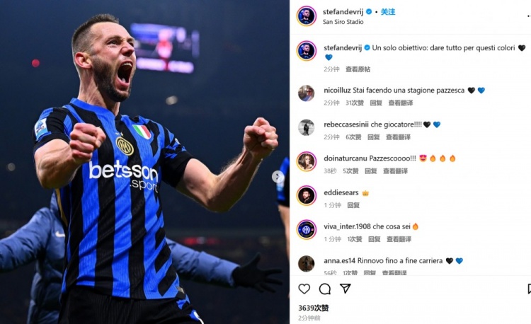 德弗里也在賽后通過(guò)社媒曬出自己怒吼慶祝的照片,并配文:“我們只有一個(gè)目標(biāo):那就是為藍(lán)黑色竭盡全力。”