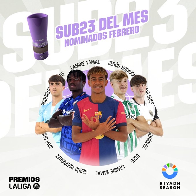 2月20日訊 西甲官方公布了2月最佳U23球員5人候選,17歲亞馬爾入選。