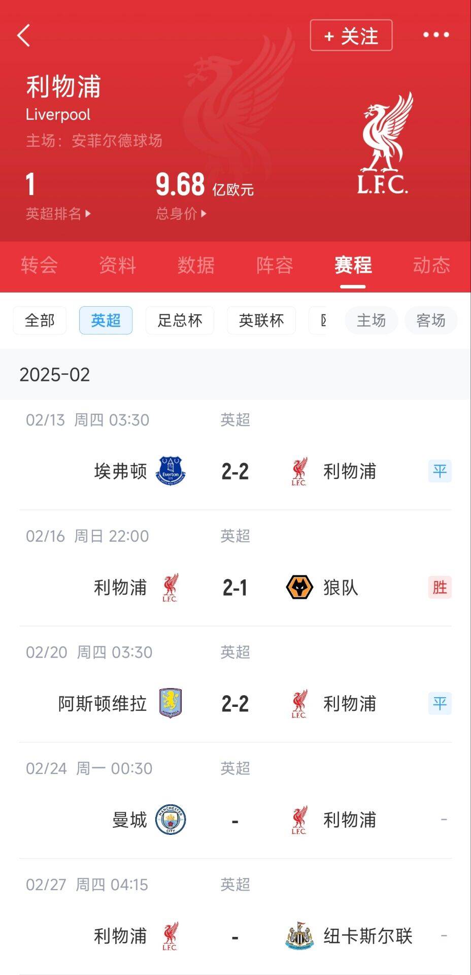 02月20日訊 利物浦在今天凌晨的一場(chǎng)英超比賽2-2戰(zhàn)平維拉,現(xiàn)多賽一場(chǎng)8分領(lǐng)跑英超。