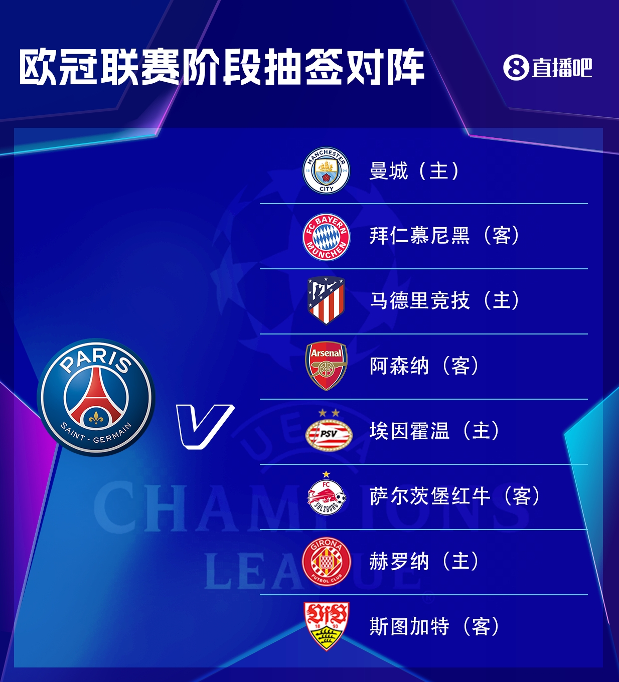 歐冠聯(lián)賽階段中,巴黎則是抽到了曼城、拜仁、馬競(jìng)、阿森納、埃因霍溫、薩爾茨堡紅牛、赫羅納、斯圖加特。