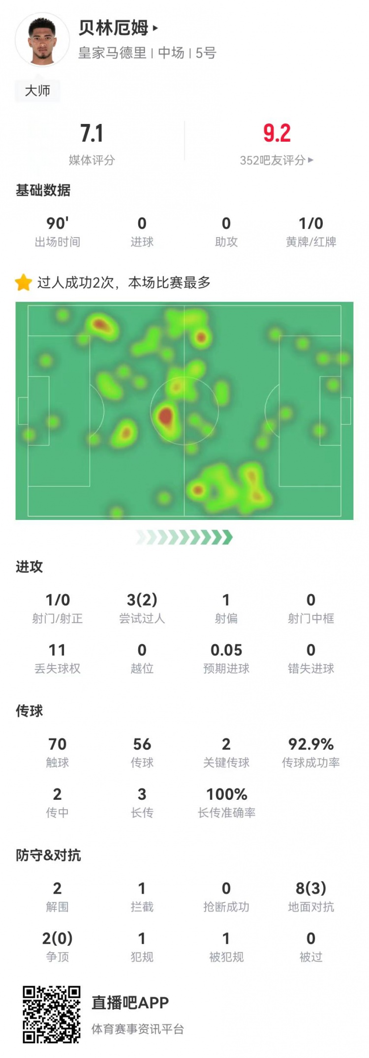 2月20日訊 皇馬在本輪歐冠次回合3-1擊敗曼城,貝林厄姆本場(chǎng)數(shù)據(jù)如下:
