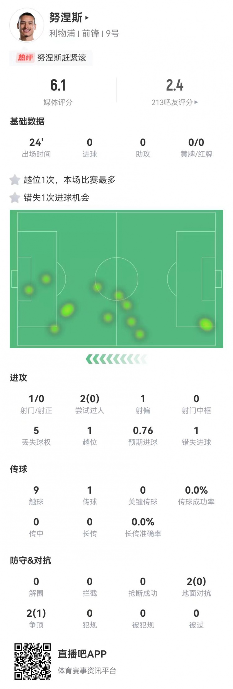 2月20日訊 利物浦在本輪英超2-2戰(zhàn)平阿斯頓維拉,努涅斯本場數(shù)據(jù)如下: