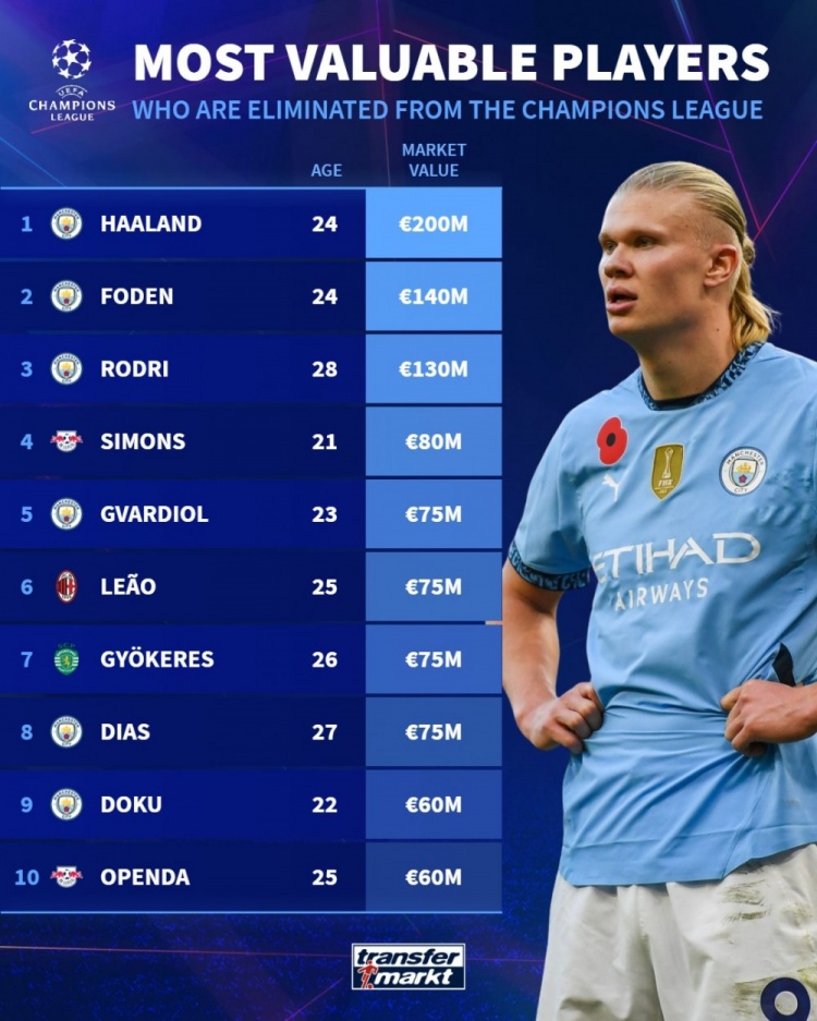 2月20日訊 歐冠淘汰賽附加賽階段比賽戰(zhàn)罷,德國轉(zhuǎn)會市場列出了歐冠出局球員身價排名,哈蘭德2億歐居首,曼城包攬前3名,前10占6席。