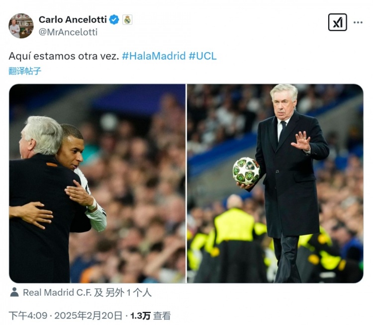 皇馬主帥安切洛蒂更新社媒動態(tài),曬出與姆巴佩擁抱的照片,配文:“我們又來了,Hala Madrid!”
