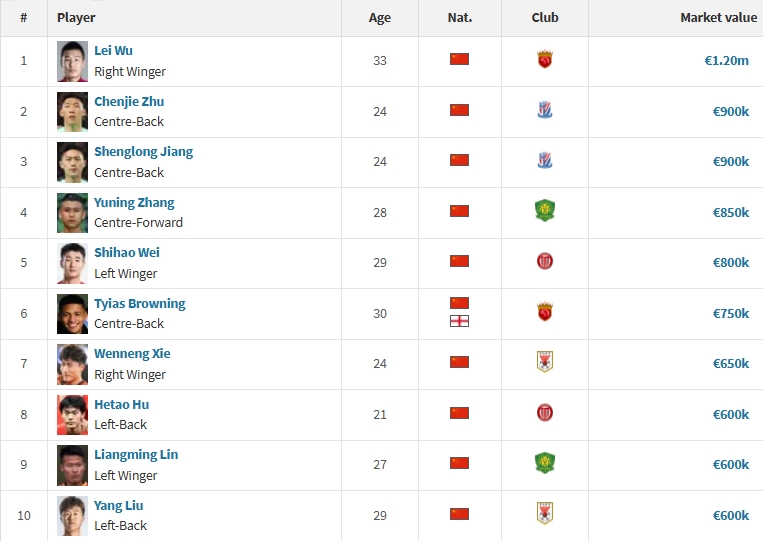 中國籍球員身價(jià)排行前十(單位:歐元):