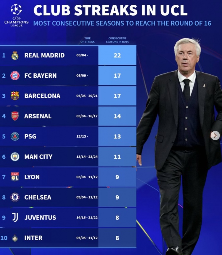 2月21日訊 皇馬在本輪歐冠附加賽雙殺曼城,成功挺進歐冠十六強?!掇D會市場》也統(tǒng)計了歐冠歷史最長連續(xù)晉級十六強榜單。