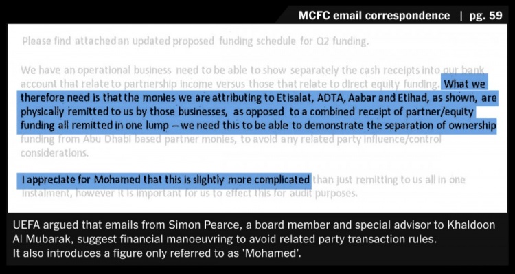 歐足聯(lián)表示,西蒙-皮爾斯的郵件中表明,為規(guī)避關(guān)聯(lián)交易規(guī)則,進(jìn)行了一些財務(wù)操作。西蒙-皮爾斯是曼城董事會成員,也是穆巴拉克的特別顧問。郵件中還引入了一個叫做“穆罕默德”的代稱。