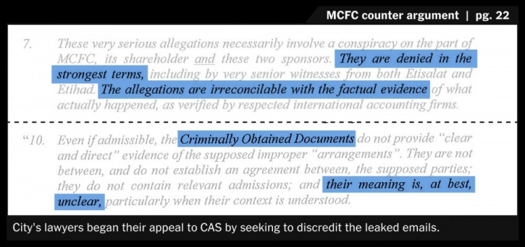 曼城向CAS提出了上訴,聲稱他們不必對泄露的郵件進(jìn)行身份驗(yàn)證,并認(rèn)為它們超出了審查小組的需要。