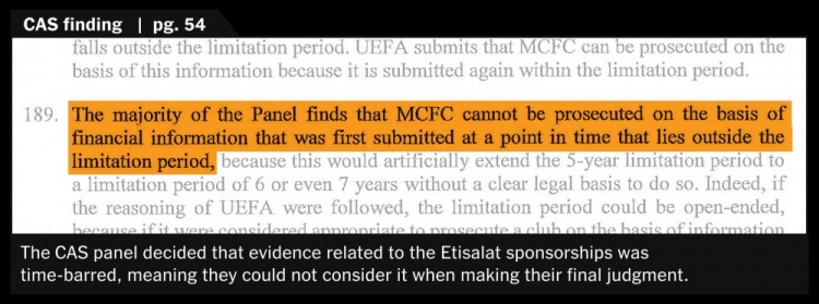 在CAS審理過程中,盡管最初曼城被認(rèn)定違規(guī),但上訴委員會發(fā)現(xiàn),他們無法確保這些所謂的阿聯(lián)酋電信付款的合法性——因?yàn)樗鼈円呀?jīng)超過時效了。不過根據(jù)TA咨詢的法律專家表示,這對于英超聯(lián)賽處罰并不會造成阻礙。