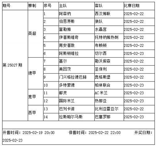 傳足勝負彩第25027期競猜賽事中不乏豪門出戰(zhàn):英超方面,阿森納主場對陣西漢姆,切爾西客場挑戰(zhàn)維拉;意甲,國際米蘭主場迎來熱那亞;西甲賽場上,巴薩客場面對拉斯帕爾馬斯。