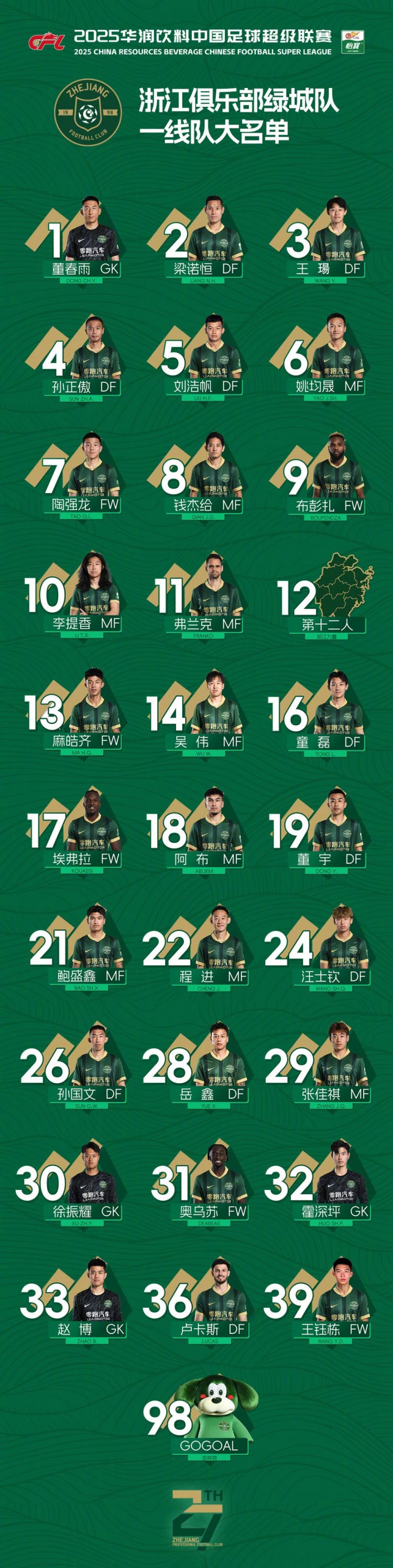 2月21日訊 浙江隊官方公布了2025賽季一線隊大名單,布彭扎、弗蘭克、埃弗拉、奧烏蘇、盧卡斯5名外援領(lǐng)銜,陶強龍、童磊、王鈺棟在列。