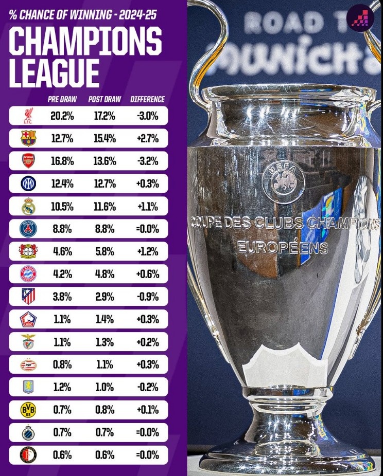 此外國(guó)米、皇馬、勒沃庫(kù)森、拜仁奪冠概率均在抽簽后有所提升,馬競(jìng)下跌了0.9%。