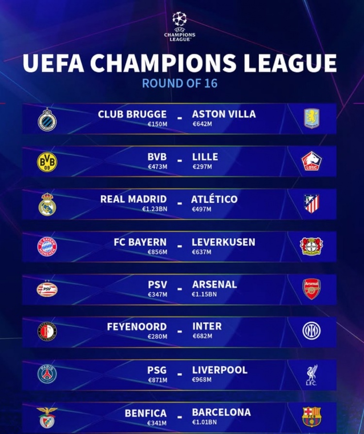 2月21日訊 歐冠十六強(qiáng)對(duì)陣已經(jīng)出爐,《轉(zhuǎn)會(huì)市場(chǎng)》也列出了各隊(duì)身價(jià)情況。