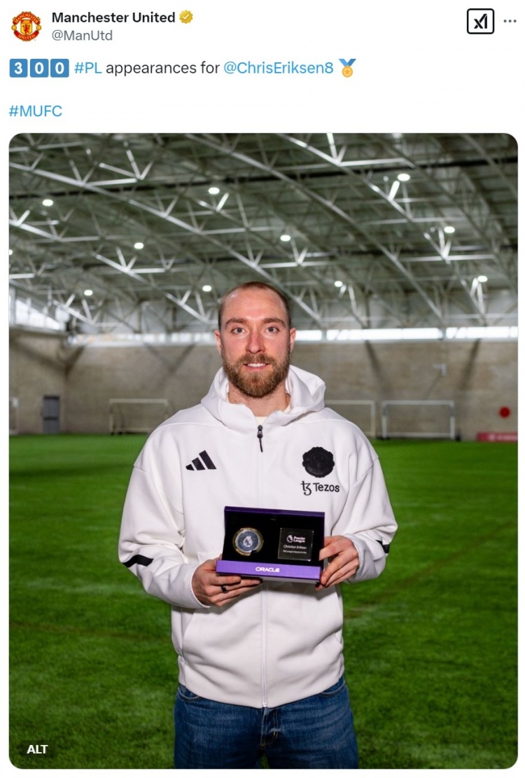 曼聯(lián)官方社媒曬出埃里克森領(lǐng)取紀(jì)念品的照片,祝賀他達(dá)成英超300場里程碑。