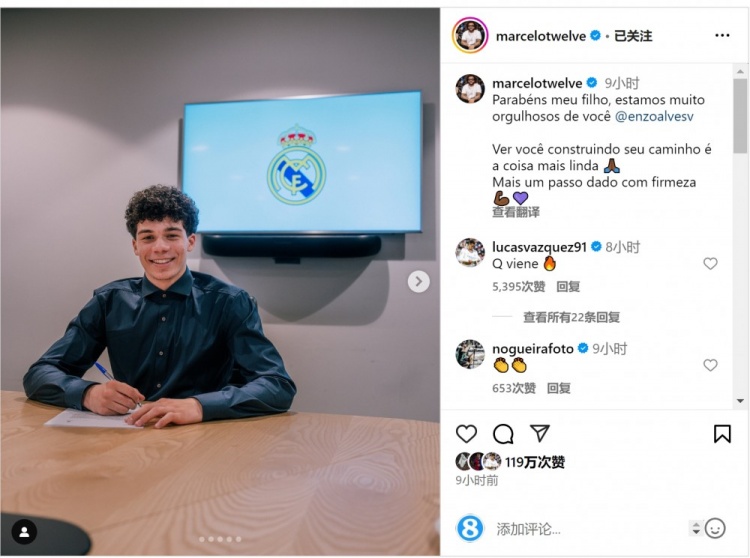 2月22日訊 馬塞洛更新社媒動(dòng)態(tài),祝賀兒子與皇馬簽下續(xù)約合同。