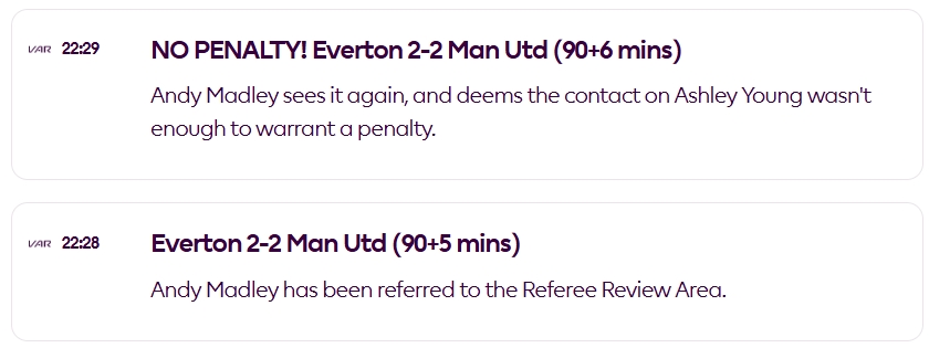 英超官方比賽中心隨后給出了更為官方的說法,VAR檢查了裁判給埃弗頓的點球判罰,認(rèn)為馬奎爾對阿什利楊并沒有犯規(guī),建議主裁對回放進行審查。主裁判最終推翻了原有判罰,并以間接任意球重新開始比賽。