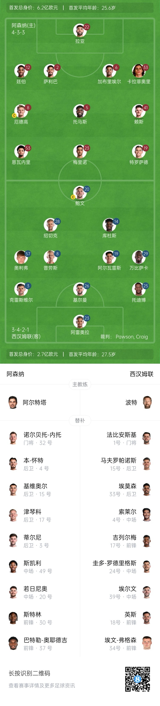 阿森納首發(fā):22-拉亞、2-薩利巴、6-加布里埃爾、12-廷伯、33-卡拉菲奧里、5-托馬斯、8-厄德高、41-賴斯、53-恩瓦內(nèi)里、19-特羅薩德、23-梅里諾