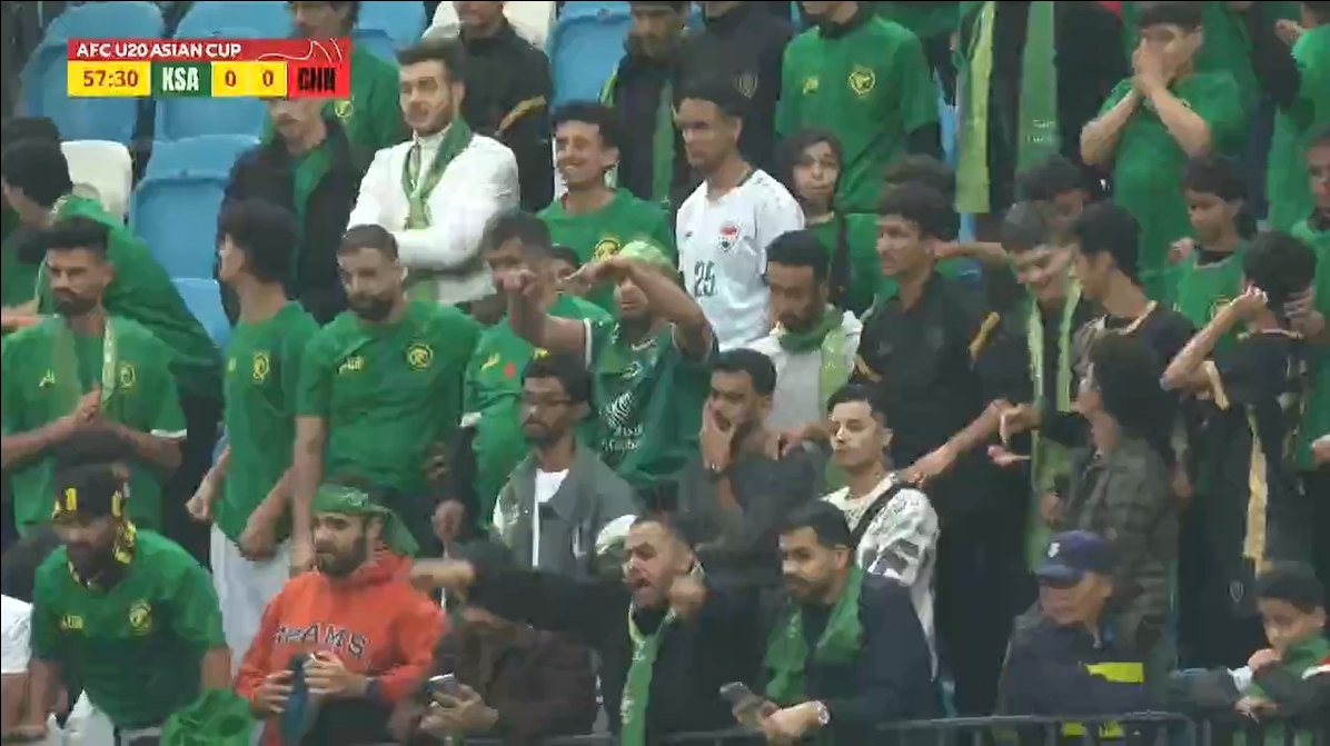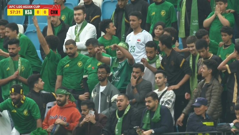 主裁做出判罰后,球門后的沙特球迷非常不滿,手比劃著示意看VAR。