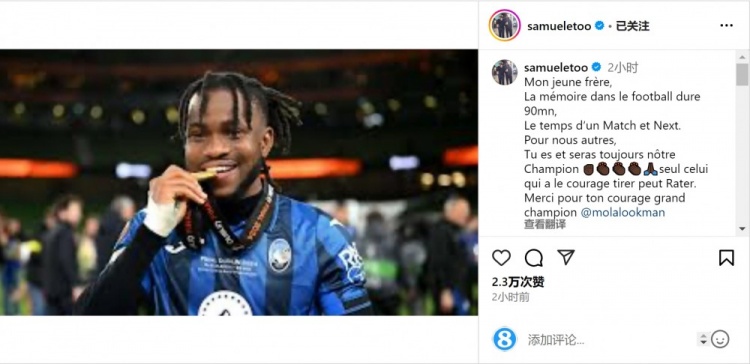 非洲足壇名宿、喀麥隆足協(xié)主席埃托奧社媒發(fā)文,鼓勵(lì)盧克曼(尼日利亞前鋒),他寫(xiě)道:“我的小老弟,在足球世界里記憶只存留90分鐘,這是一場(chǎng)比賽的時(shí)間,然后就是下一場(chǎng)?!?/p>
