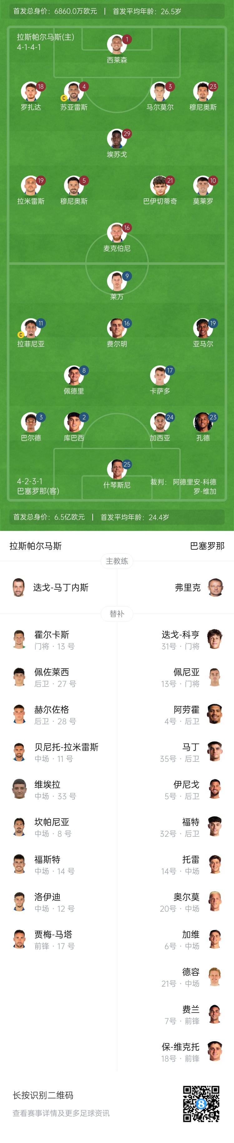 巴薩首發(fā):25-什琴斯尼、2-庫巴西、3-巴爾德、23-孔德、24-埃里克-加西亞、8-佩德里、16-費爾明、17-卡薩多、11-拉菲尼亞、19-亞馬爾、9-萊萬