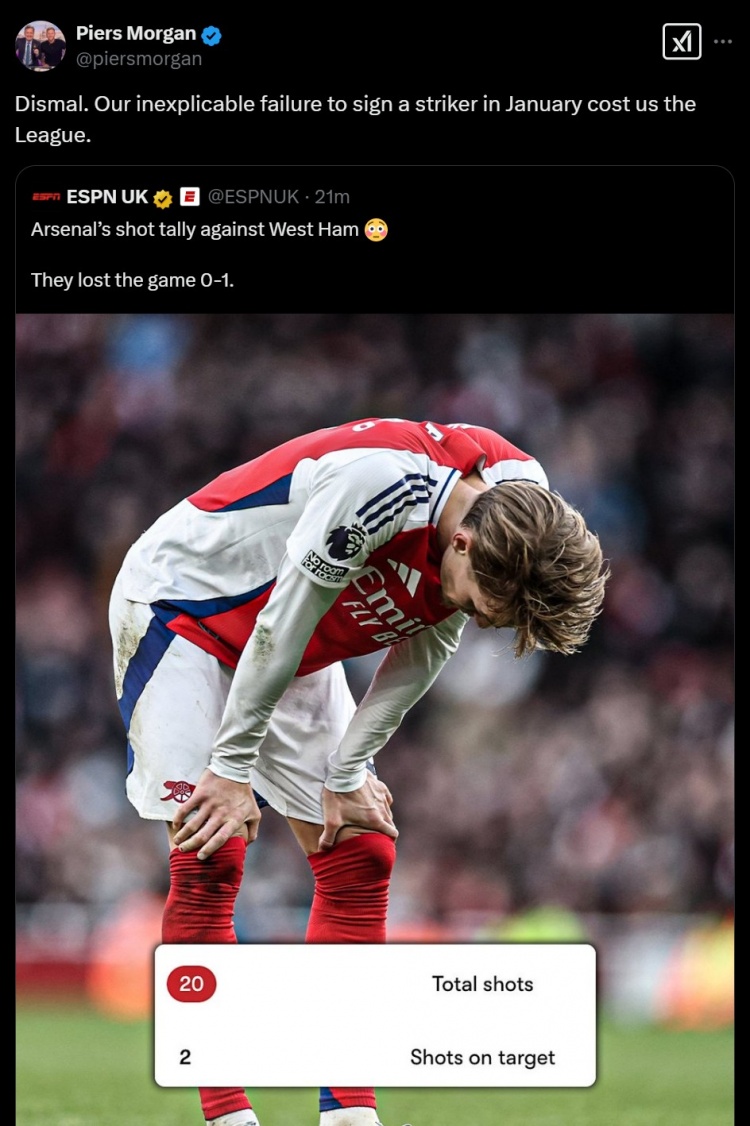 本場(chǎng)比賽,阿森納狂轟了20腳射門,但只有2次射正。摩根轉(zhuǎn)發(fā)了這一數(shù)據(jù),并寫(xiě)道:太差勁了。我們一月份莫名其妙地沒(méi)能簽下一名前鋒,這導(dǎo)致我們丟掉了聯(lián)賽冠軍。