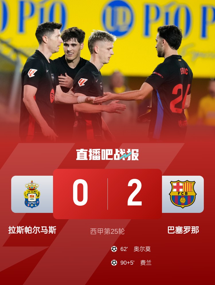西甲第25輪,巴薩2-0拉斯帕爾馬斯1分優(yōu)勢領(lǐng)跑,奧爾莫、費(fèi)蘭進(jìn)球。