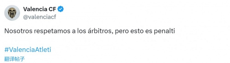 瓦倫西亞官方社媒曬出加蘭手球的視頻,配文:“我們尊重裁判,但這是一個點球。”