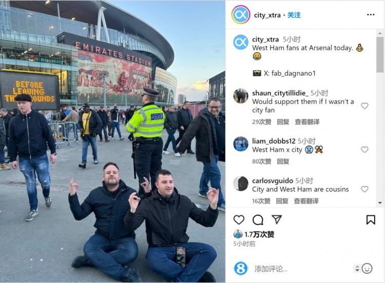此役賽后西漢姆球迷在場外做出哈蘭德標(biāo)志性的打坐慶祝動(dòng)作,哈蘭德在社交媒體上為相關(guān)照片點(diǎn)贊。