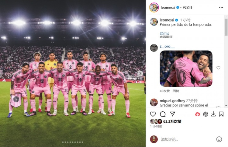 梅西曬出了比賽照片,并配文:“新賽季的第一場(chǎng)比賽。”