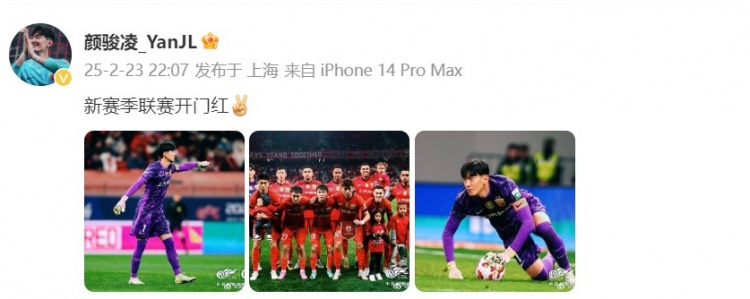 2月23日訊 中超聯(lián)賽首輪,上海海港主場3-1擊敗深圳新鵬城。賽后,海港門將顏駿凌發(fā)文慶祝勝利。