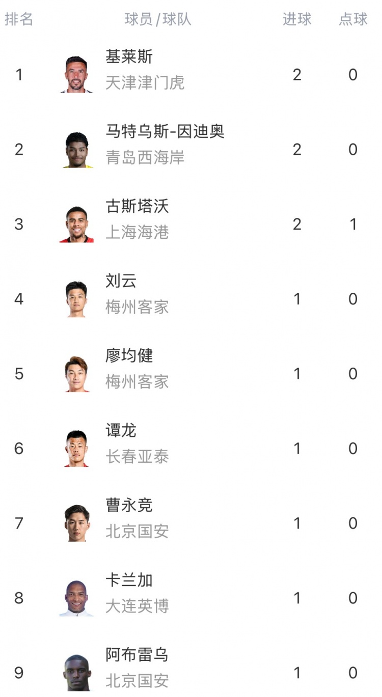 完成梅開二度的津門虎外援基萊斯、西海岸外援馬特烏斯、海港外援古斯塔沃,并列位居射手榜榜首。另外,還有14名球員打入1球。