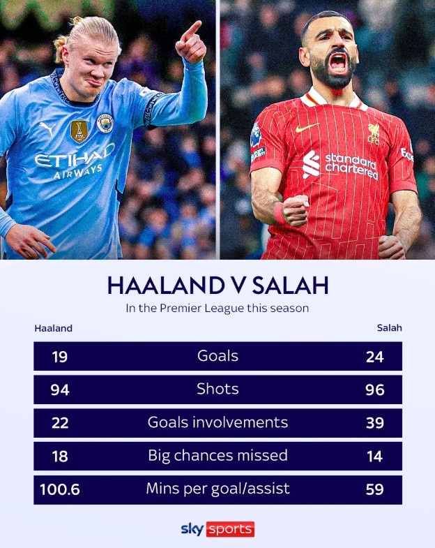 2月23日訊 在本輪英超曼城對陣?yán)锲值慕裹c(diǎn)戰(zhàn)前,天空體育對比了兩隊(duì)當(dāng)家前鋒哈蘭德和薩拉赫本賽季聯(lián)賽的數(shù)據(jù)。