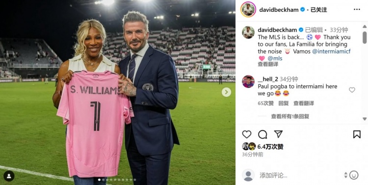 美國傳奇網(wǎng)球巨星小威廉姆斯也來到現(xiàn)場觀戰(zhàn),貝克漢姆贈(zèng)與其1號(hào)球衣并合影留念。貝克漢姆也在個(gè)人社媒配文寫道:“美職聯(lián)比賽回歸了!感謝主場球迷的熱情支持,邁阿密國際加油!”