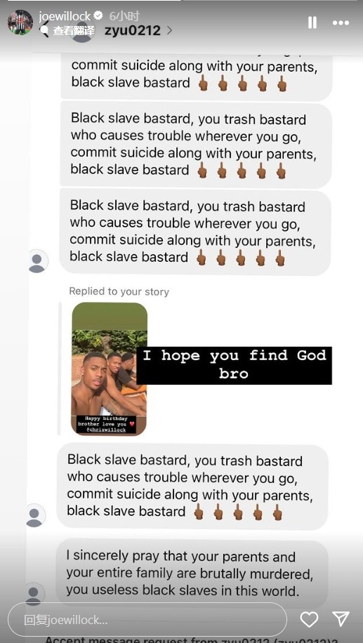 另一位球迷給威洛克發(fā)送了大量的攻擊性信息,稱威洛克是“黑人奴隸”,并一同詛咒辱罵了威洛克的家人。