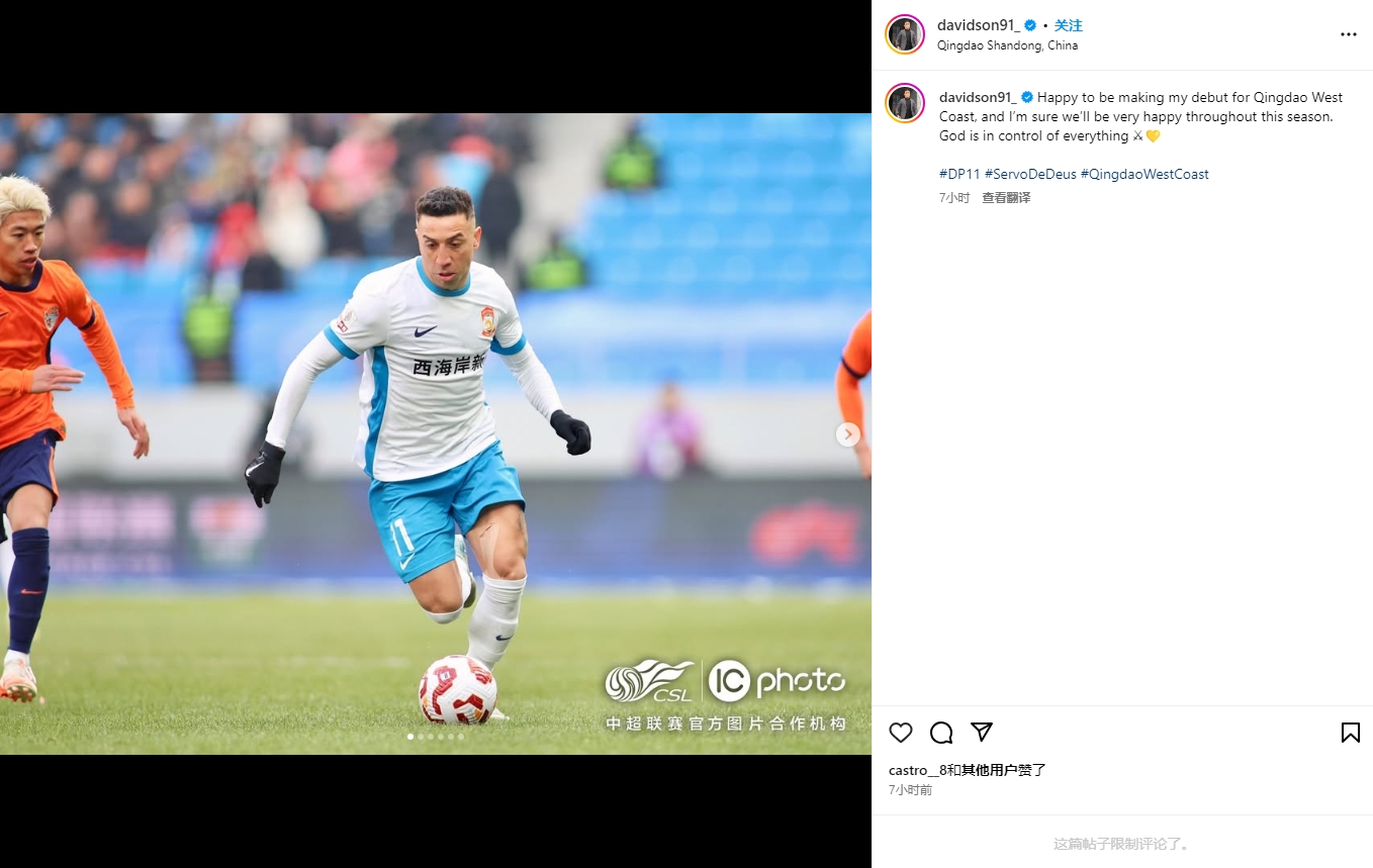 2月25日訊 中超首輪青島德比結(jié)束后,戴維森更新社媒,談到了自己代表西海岸首秀的感受。