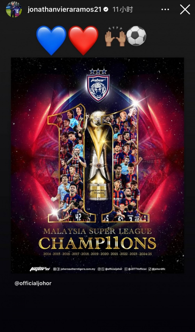 24日進(jìn)行的馬來西亞超級聯(lián)賽第22輪比賽,柔佛新山主場2-0擊敗霹靂,提前4輪問鼎本賽季冠軍。賽后,比埃拉曬出了奪冠的海報,并附上了多個表情慶祝柔佛新山提前奪冠。