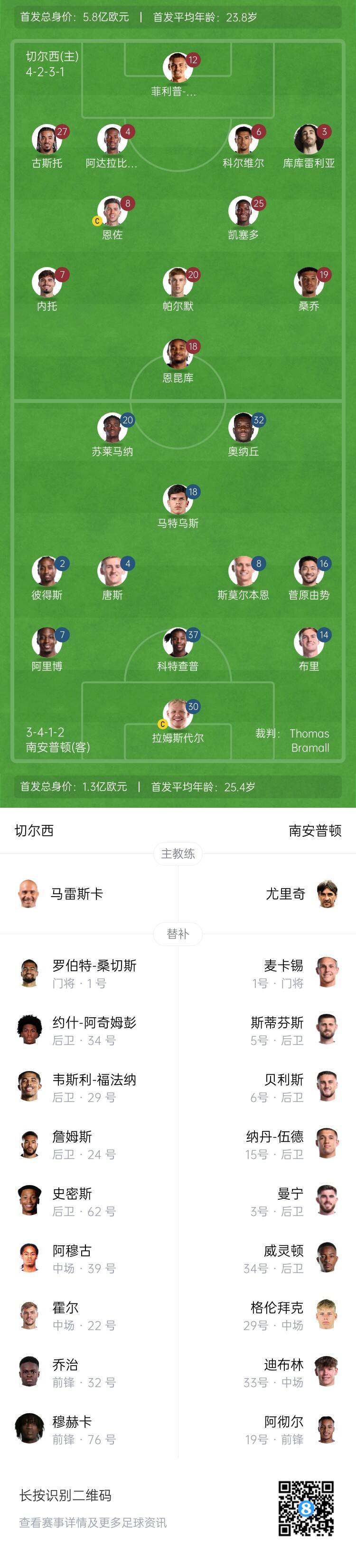 切爾西替補(bǔ):1-羅伯特-桑切斯、24-里斯-詹姆斯、29-韋斯利-福法納、34-阿奇姆蓬、62-塞繆爾斯-史密斯、22-霍爾、39-阿穆古、32-喬治、76-穆赫卡